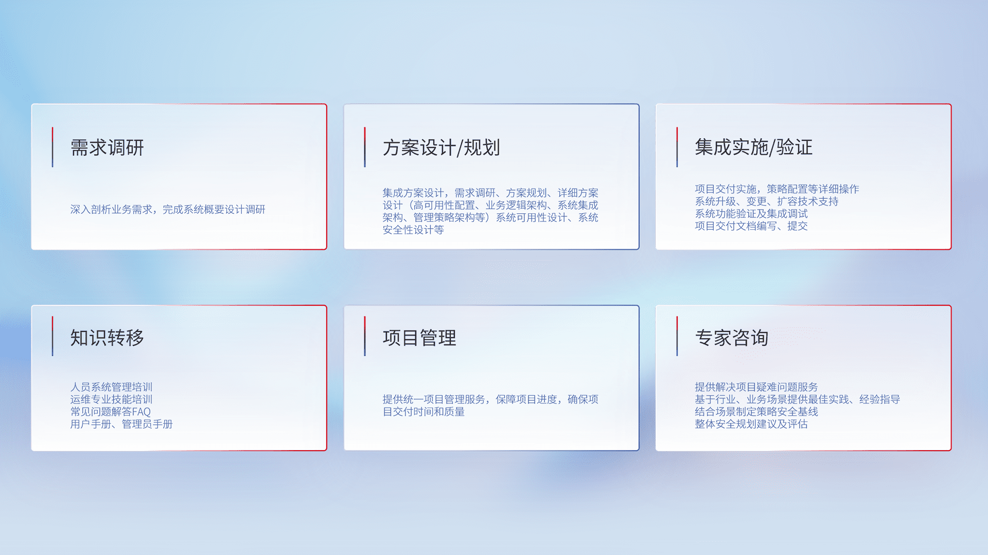 针对客户行业特性,,,,将宏观的安全战略和需求,,,,通过专业的交付服务,,,实现项目落地,,为客户提供标准规范的集成交付服务。。